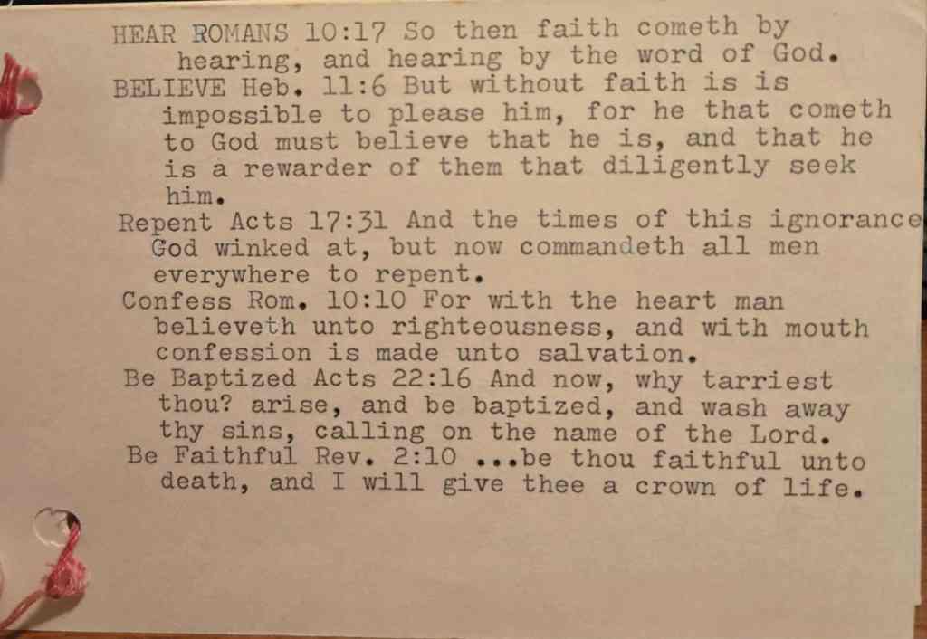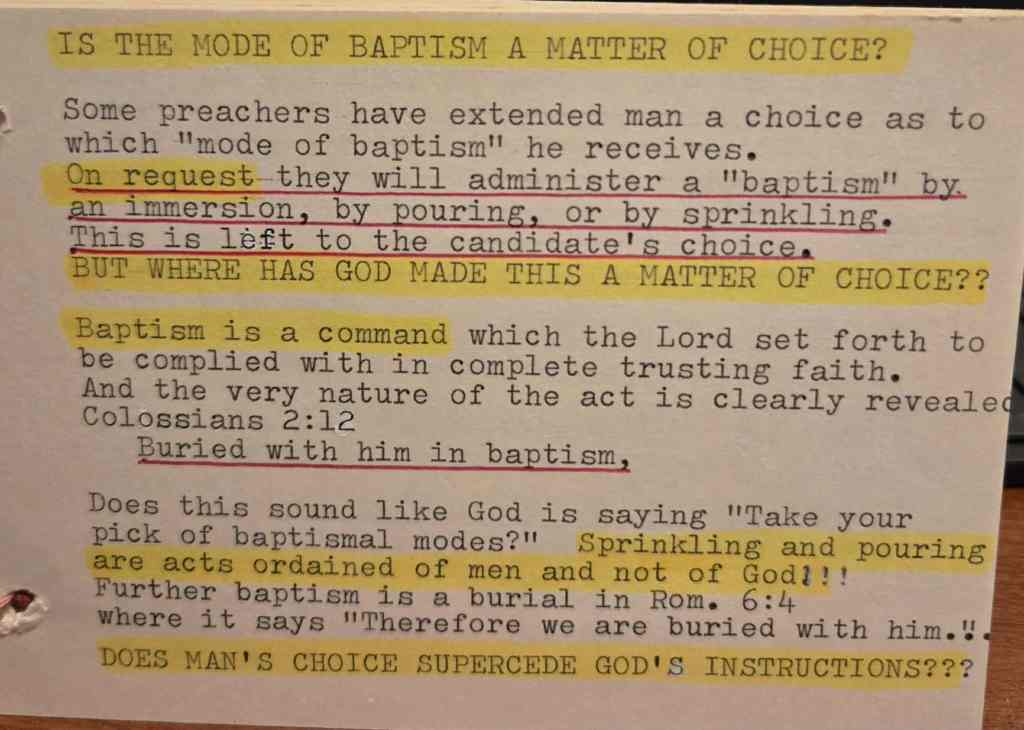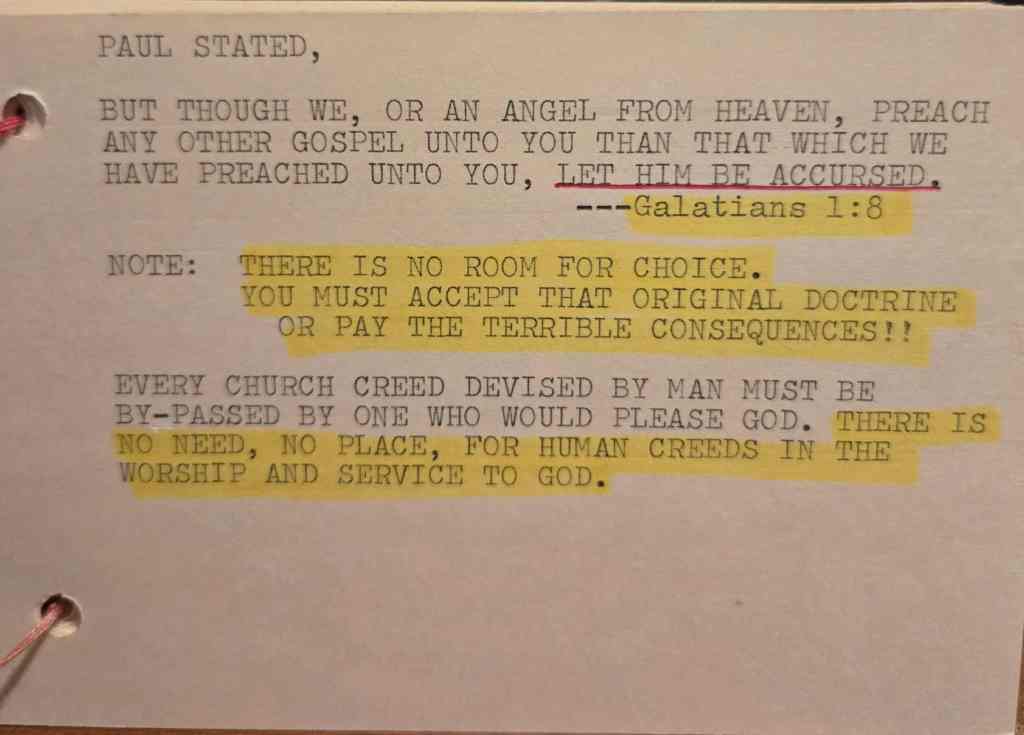 The sermon emphasizes obedience to the New Testament pattern, anti-creedal sentiment, and is hyper-legalistic. I find the use of Galatians 1:8 to justify their position particularly heartbreaking. Meaning they believed that all other churches not obeying the New Testament Pattern were teaching that other Gospel. Salvation by Faith Alone was the false gospel.